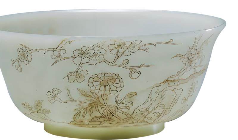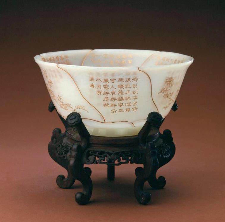 北京故宫博物院收藏的清乾隆年间制成的和阗白玉错金嵌宝石碗便是此工艺的经典之作。该碗只有4.8厘米高,口径14.1厘米,足径7厘米,用顶级和阗白玉雕成,配桃形双耳,底部是花瓣形状的圈足。最特别的是碗壁薄得透光,却用黄金嵌出枝叶花纹,108颗鲜艳夺目的红宝石组成的花朵在玉碗上绽放,黄金与红宝石在白玉的映衬下交相辉映,奢华得让人移不开眼。碗的内壁有阴文楷书乾隆皇帝御制诗一首,内容是关于用玉碗盛牛乳等的情景,夸耀此碗比羊脂白玉更珍贵,还标注了“乾隆丙午新正月”“御题”字样和“比德”印章。碗内底正中间刻着隶书“乾隆御用”四个字,一看就是妥妥的皇帝专属款。据说,乾隆皇帝对这类带有异域风格的玉器极为喜爱,连喝茶都舍不得离手,庆典时还要拿出来赐茶。