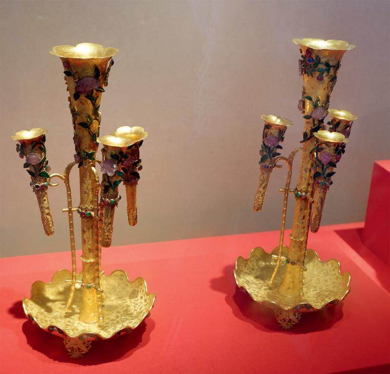 北京故宫博物院珍藏的金嵌玉石四筒花插是金基嵌玉工艺的杰出代表。这是一对金质的四筒花插,高34.6厘米,宽15.6厘米,上部由一大三小四个插筒组成,花插筒下方为雕有花朵枝叶的托盘,托盘底部有三个蝶翅形足稳稳支撑。该花插最令人惊艳的是它的装饰,在纯金表面雕刻着繁复的花纹,又用累丝工艺盘绕出花叶形状,还镶嵌了各色宝石,尤其是叶蔓处镶嵌的翠玉格外亮眼。器物底部有“足赤”(说明含金量达标)和“宝华”(制作坊号)戳记,表明该花插是用纯金打造的精品,从而彰显皇家御用的身份。