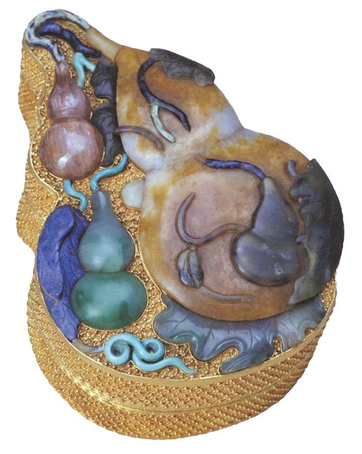 北京故宫博物院中珍藏的清代金嵌玉石葫芦式盒也十分有趣,堪称“多子多福”的吉祥化身。这个高6厘米、长15厘米、最宽处为10.5厘米的黄金盒子被做成可爱的葫芦形状,表面用金丝编织出精致花纹,盖子中央嵌着一个大的玉质葫芦,上面还趴着用青金石制成的小葫芦和绿叶。更妙的是,盒盖周围还点缀着粉碧玺葫芦、翡翠小葫芦各一个,葫芦的藤蔓则用青金石和绿松石雕成,活脱脱把“子孙满堂”的寓意刻在了盒子上。打开盒子,里面竟藏着一块蓝宝石和一柄铜镀金小如意,寓意“万事如意”。这件金玉满堂的宝贝真是把所有美好祝福都装了进去。