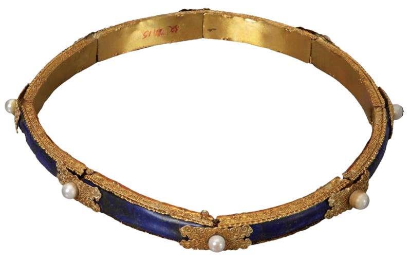 如果你仔细观察北京故宫博物院珍藏的清代后妃生活用品,会发现很多首饰都是以黄金为底、上面镶嵌玉石或宝石。其中,有一种叫“金约”的头饰是后妃穿朝服时一定要戴的,其主要作用是把头发束起来,同时支撑头顶的朝冠。金约一般由两部分组成,分别是金色的箍圈和箍圈后面垂缀下来的串珠。北京故宫博物院现存的一件金镶青金石金约有点儿特别,其后面垂缀的串珠已然丢失,只剩下金色的箍圈。这个金色的箍圈外径21.5厘米,内径18.6厘米,最厚的地方有1.2厘米。它不是用一整块金子做的,而是分成八节,每节中间都镶嵌着一块青金石,相邻两节之间以梅花状的金色铆钉连接。在金箍的外侧还装饰着用细金丝编织成的金色云纹造型,并镶嵌着一颗东珠,做工十分复杂,尽显奢华之美。另外,还有一种被称为“领约”的饰物,是清代后妃穿朝服时佩戴于颈部用以固定衣领的饰品。领约通常为环形,有活口可以开合,有些类似项圈。北京故宫博物院现存的一件金镶青金石领约,周长46厘米,直径22厘米,环上镶了四块长条形青金石、两块红色玉石(可能是人工制作的红色石料),还嵌着两颗红宝石、两颗蓝宝石和一颗珍珠。其活口部分由黄金制成,上面雕刻出云纹和蝙蝠图案,且系着明黄色的绦带,尽显宫廷服饰的精致华美与端庄大气。