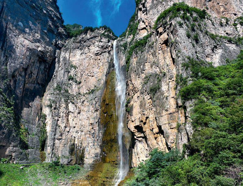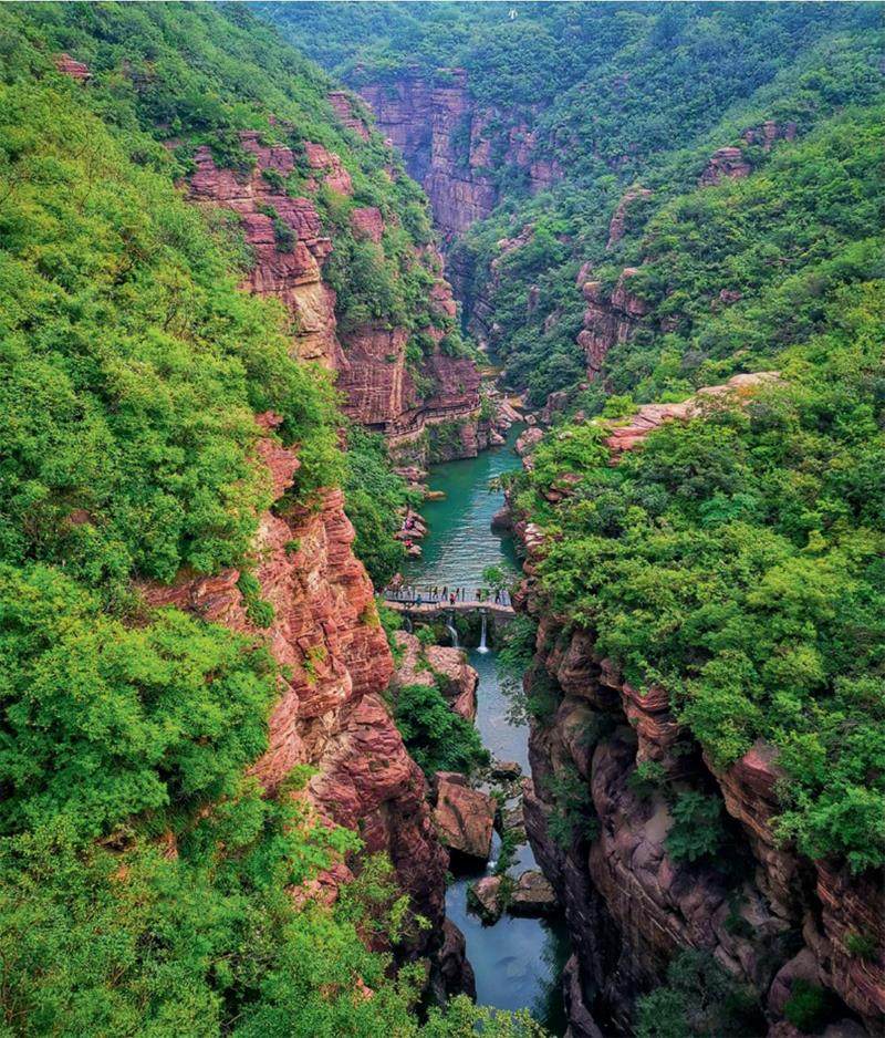 在河南省焦作市修武县境内,有一座著名的云台山。这里地处太行山脉最南端,南临华北平原,恰是中国地理版图第二阶梯与第三阶梯的交界处,地理位置十分特殊,地貌景观与众不同。这里的丹霞碧水如诗如画,飞瀑流泉点缀其中,游人至此可春赏山花、夏观飞瀑、秋醉红叶、冬品冰挂,云台山也被人们称赞“集雄、险、秀、幽、奇于一身”。