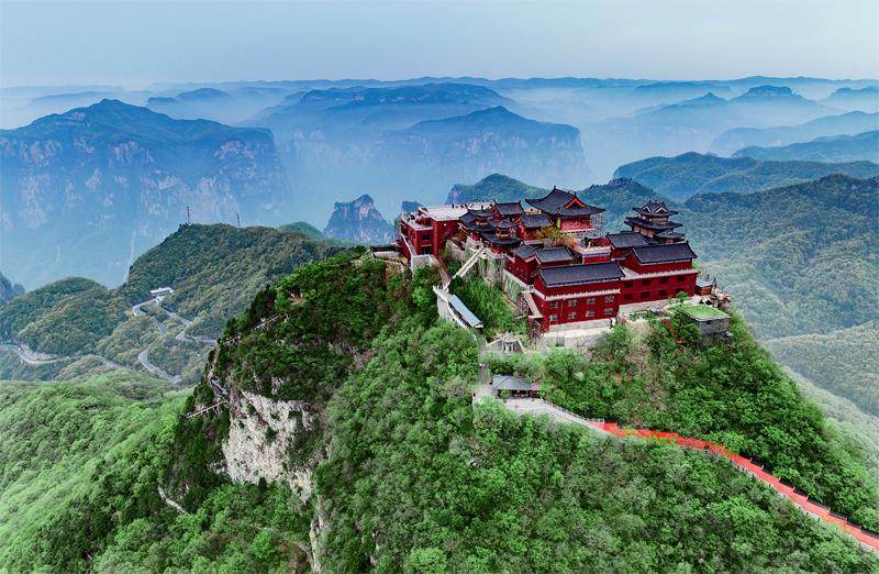 山不在高,有仙则名。茱萸峰曾被称为“小北顶”,与湖北武当山的“南顶”相对应,传说真武大帝成仙后虽镇守武当山,但茱萸峰是其重要行宫。在道教传说中,真武大帝的主要职责是镇守北方,护佑众生平安。对真武大帝的信仰,源于古人对北方星宿“玄武”的崇拜,后来逐渐将其人格化,所以人们又称“玄武”为“玄武大帝”。民间有许多关于真武大帝的神话故事和记载,传说他曾到过云台山,并被这里的灵山秀水所吸引,决定在此结庐修炼。最终,真武大帝在茱萸峰顶得道升天,成为执掌北方天界的神仙,镇妖降魔、济世度人。如今,在茱萸峰的峰顶,还伫立着一座古色古香的道观——玄帝宫。这座道观占据了茱萸峰的整个峰顶,由此形成了茱萸峰顶既是道观、道观也是茱萸峰顶的奇特景观。