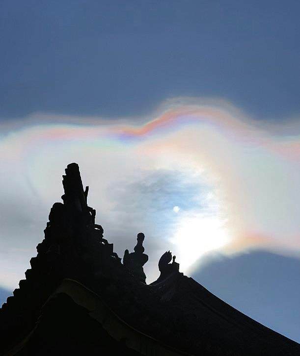 天空中出现的七彩祥云也被称为“庆云”。古时,交通信息闭塞,人们罕闻寡见,绚烂夺目的七色云彩的出现必定引起轰动。古代皇帝也多利用这种现象自我神化,以表示自己是“奉天承运的真龙天子”。