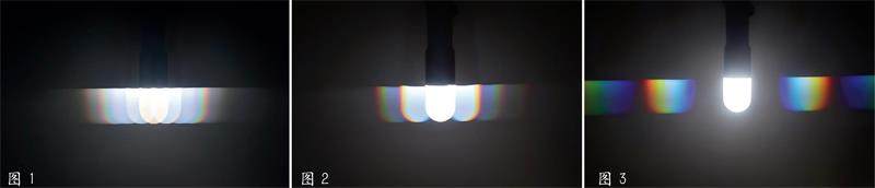 通过衍射光栅这一光学元件,我们可以更好地观察衍射现象。衍射光栅是一种能将复合光色散为按波长排列的单色光的光学元件,由一组精密刻制的等距等宽平行排列的狭缝构成。下图是3个不同的衍射光栅,分别为每毫米50线、100线、300线。图1中,50线的光栅线间距为0.02毫米;图2中,100线的光栅线间距为0.01毫米;图3中,300线的光栅线间距为0.003毫米。透过它们去看灯光,可以看到整齐有序排列的彩色条纹,而且透过不同间距的光栅看到的彩色条纹大小和形状也不同。三张图相比,透过图3线间距为0.003毫米的光栅(也就是3000纳米)看到的彩色最明显,这表明,光栅的线间距越接近光的波长,衍射作用越显著,呈现的色彩越清晰明亮。所以,云中微小冰晶的尺寸影响着彩云的形成和外观。