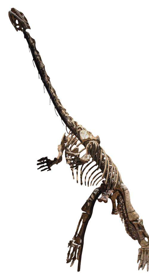 不过,并非所有的恐龙都这样友善。全长可达6米的三叠中国龙长有硕大的头骨和锋利的牙齿,后肢粗壮有力,手指和脚趾的末端还有尖锐的爪子,是禄丰蜥龙动物群中最凶恶的肉食性动物。虽然许氏禄丰龙的手指上也生有硕长的爪子,但它们头小颈长,牙齿也并不适合撕咬皮肉,所以在单打独斗中比不过凶恶的三叠中国龙。