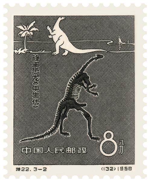 1958年,我国邮政总局发行了一套三枚《中国古生物》纪念邮票,分别为“篙里山三叶虫(古生代)”“禄丰恐龙(中生代)”和“肿骨鹿(新生代)”。其中的“禄丰恐龙(中生代)”便是许氏禄丰龙。这枚邮票是全世界发行的第一枚恐龙邮票。