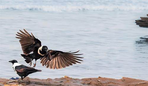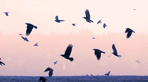 在我国,大部分乌鸦和喜鹊、斑鸠、啄木鸟一样,是常见的留鸟,它们不随季节迁徙,通常终年生活在其出生地。我国最常见的是大嘴乌鸦、小嘴乌鸦、达乌里寒鸦,它们常常混群越冬。虽然它们的体色多为单调的黑色,但也构成了自然景色中的点睛之笔。“斜阳外,寒鸦万点,流水绕孤村。”在残阳如血的天空,寒鸦让人们感受到了萧瑟天地之间的生命脉动。