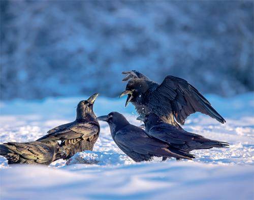 鸟类学家对渡鸦的叫声有着浓厚的兴趣。渡鸦是鸦属中分布最广的物种,它体形很大,体长六七十厘米,翼展超过一米,成鸟全身羽毛黑色,闪烁着金属的紫绿光泽。渡鸦的叫声嘈杂且多样,能发出二三十种叫声,如“呱—呱”“格—格”“嘎—嘎”“喔—喔”等,还能发出尖锐刺耳的金属敲打声,甚至能学人说话。当领地遭到入侵威胁时,威胁越严重、越持久,渡鸦的叫声就越响亮、越疯狂。如果这时有雌渡鸦在一旁助威,雄渡鸦会更加来劲儿,不仅发出洪亮而深沉的怒吼,还会对入侵者发动猛烈攻击。