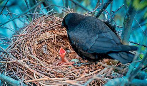 鸟类筑巢的主要目的是繁衍,而非单纯的栖息,所以“倦鸟归巢”并无科学依据。鸟类大多数时候居无定所,然而到了繁殖季,为了养育后代,给孩子一个安全温暖的庇护所,它们就必须找一个合适的地方安家。乌鸦和喜鹊一样喜欢在乔木上筑巢,它们会先用粗细不等的树枝搭建一个碗状巢,然后在巢底铺上草茎、树皮、羽毛等。由于巢穴结构相对简单,所以乌鸦搭建起来并不十分费时费力,通常两周左右便可完成。虽然乌鸦筑巢的水平远逊于喜鹊,但它们绝对算得上称职的父母。