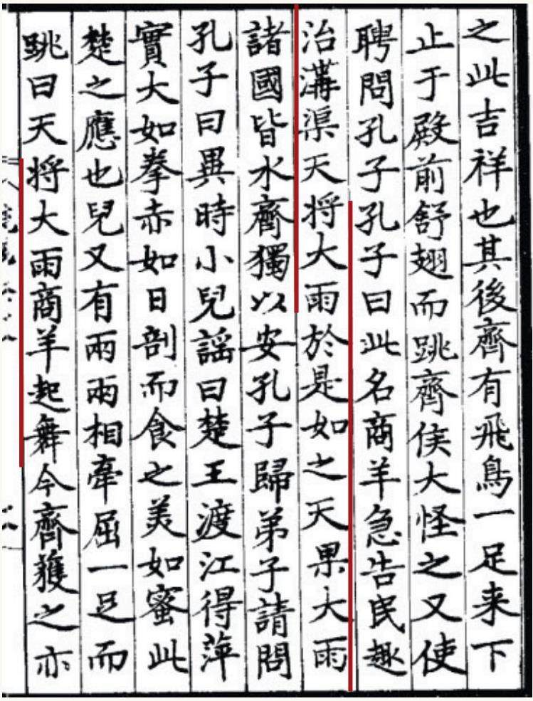 物象类谚语起于何时已失落无考,不过我们可以从典籍中发现它们的发展脉络。记录孔子及其弟子思想言行的古书《孔子家语》中记载了这样一则趣事:春秋时期,齐王的殿前飞来了一只鸟,虽然只有一条腿,它仍扇着翅膀跳跃。齐王觉得非常奇怪,于是向孔子请教。孔子说,此鸟名叫商羊,有兆雨的能力,看见它就应该赶紧让百姓疏通沟渠以防洪灾。果然,几天后,天降大雨,很多诸侯国都遭遇了洪灾,只有齐国因提早防御而免受水患。孔子之所以让齐王提前进行防范,是依据“天将大雨,商羊起舞”这句谚语做出判断的。该谚语讲述的故事在《说苑》《论衡》等汉代典籍中亦有记载,虽有传说成分,仍可看作先秦人民探寻物象与雨的关联的客观写照。