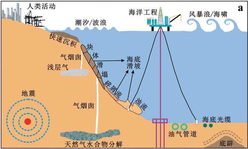 海底滑坡携带着巨大的破坏能量,发生海底滑坡时,可直接引发海啸等次生灾害,甚至诱发其他链式灾害。它所蕴含的巨大冲击力和快速移动的沉积物就像巨型坦克,能轻易破坏海底管缆系统、油气管aR0WJEYJ+tE5NjRz2Iqegw==道、油气开采井,甚至直接掀翻海上作业平台,近海滑坡则可直接破坏岸线并造成人员伤亡。