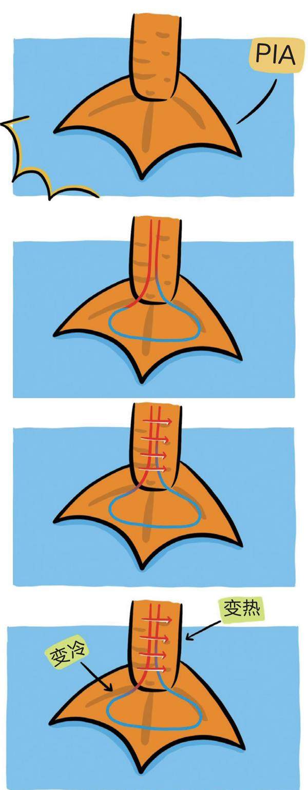 当鸭子在冰面上行走时, 动脉里的“ 热血”顺着鸭腿从上往下流。在这一过程中,“ 热血”遇到了被低温摧残后、由静脉送往躯干的“冷血”。由于动脉和静脉挨得比较近,“热血” 的热量就会不断传递给“ 冷血”, 二者发生了热交换, 流回心脏的静脉血就会“ 变热”, 而流向鸭脚的动脉血也会“变冷”。