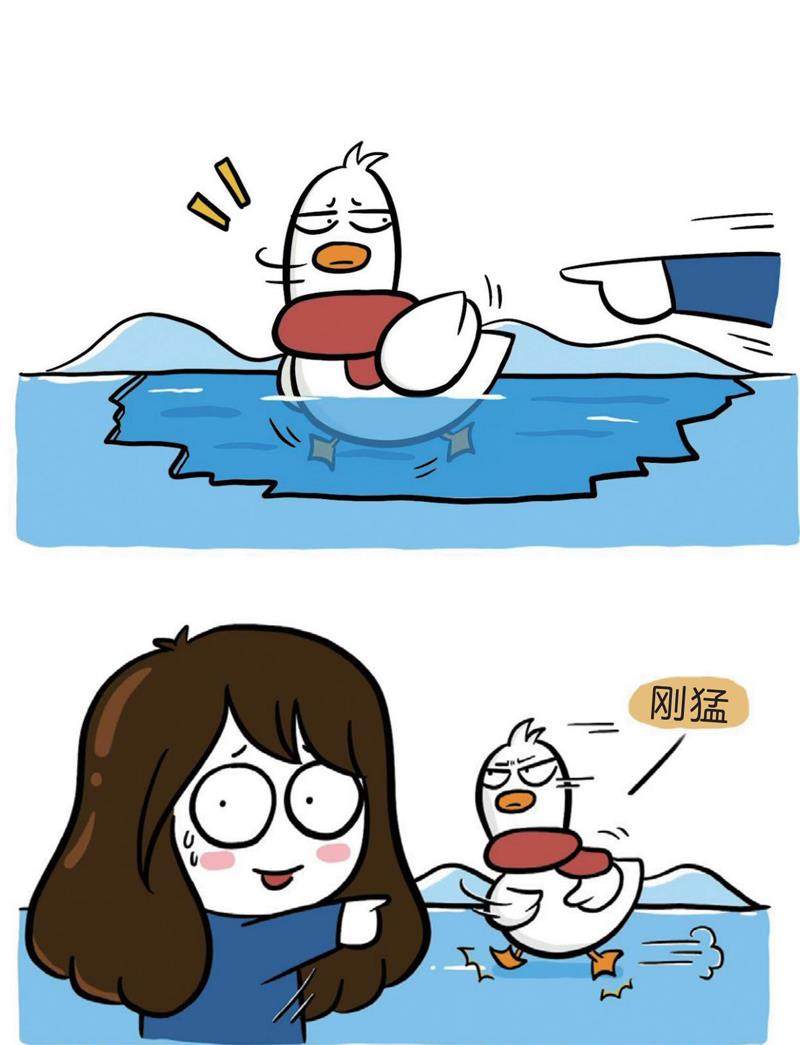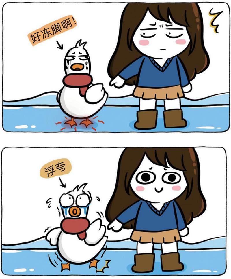 由于两个物体温差越大,高温物体向低温物体散失热量的速度就越快,当这只鸭子踩在冰面上,它就会被冻到怀疑“鸭生”。