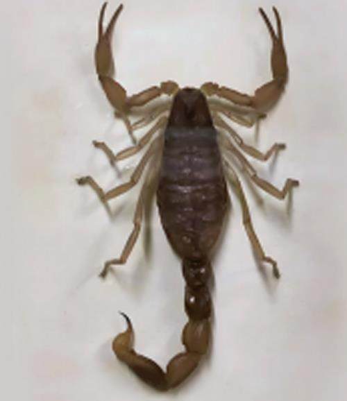 与马陆同属陆生节肢动物的马氏正钳蝎主要分布于我国华北一带,它隶属于蛛形纲、蝎目,体长约6厘米,身形似琵琶。马氏正钳蝎的“武器”是俗称“蝎子尾巴”的后腹部,其由12节组成,外形细长且能向上、向左、向右卷曲,甚至能像抽鞭子一样向前抽动。后腹部的顶端有弯钩状的尾刺,刺上的针眼状开口与毒腺相连,借助肌肉的强烈收缩,尾刺可喷射毒液。
