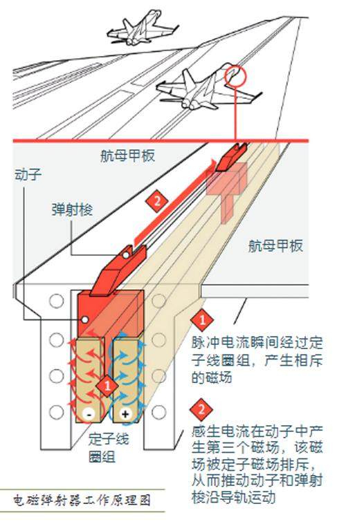 鉴于蒸汽弹射技术的诸多弊端,美国率先研发出电磁弹射技术,并于福特级航母上首次应用。这种弹射系统本质是一台巨大的直线电机,蒸汽弹射器的开口气缸和活塞在电磁弹射器中被定子线圈组和嵌入其中的动子所取代。当储能系统提前储备好大量电能后,弹射启动时,强大的电流经过线圈,在动子上产生巨大的安培力,推动舰载机加速腾空。