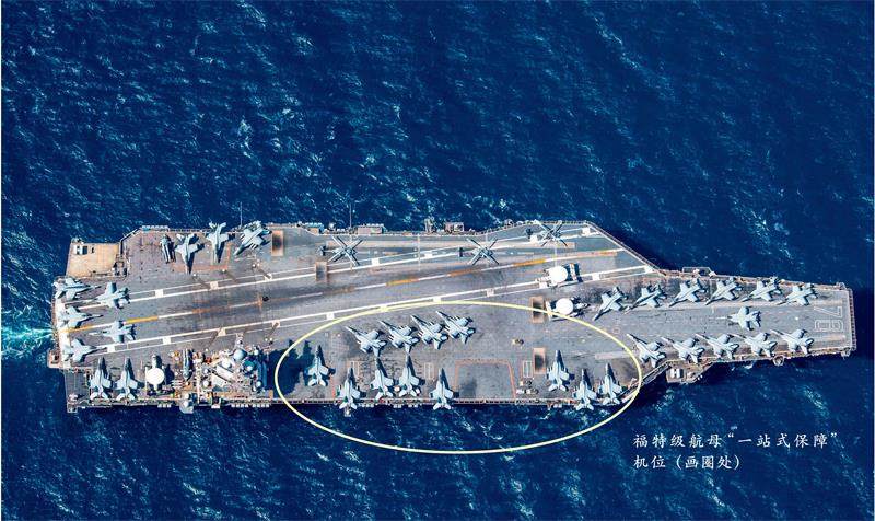 以美国尼米兹级航母为例,为了适配船体结构,满足抗损、消防等要求,其舰载机降落后的临时停放、弹药安装、维修和加油加气等地勤作业被分散在不同区域,舰载机需要被牵引车频繁转运。到了福特级航母,美军提出了“一站式保障”概念,即在舰艏和右舷设置十余个集加油、挂弹、维修于一体的专用机位。通过甲板预埋的加油/电源面板,以及更靠近作业区的4台先进弹药升降机和无人装弹车,舰载机停入机位后即可同步完成各项地勤作业,且不会干扰正常起降。美军称,这一设计将福特级航母舰载机的出动准备时间从尼米兹级航母的90分钟压缩至60分钟,出动能力提升了三分之一。
