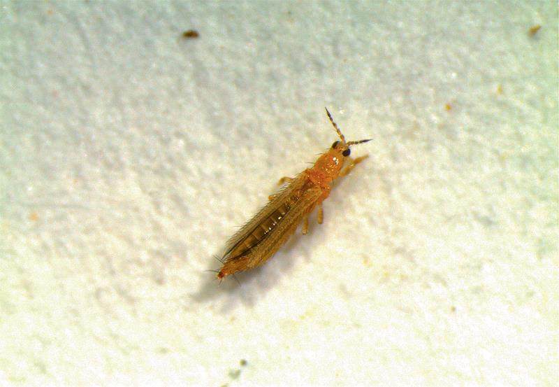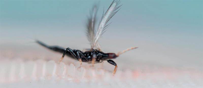 蓟马体形微小、细长而略扁,体色多为黑色、褐色或黄色,大多数成虫的体长为0.5~5毫米,少数可达10~14毫米。蓟马的口器为锉吸式口器,显著特点是呈锥状,各部分不对称,介于咀嚼式口器和刺吸式口器之间。取食时,蓟马会用口器刺破寄主植物的组织,然后吸取其中的汁液。