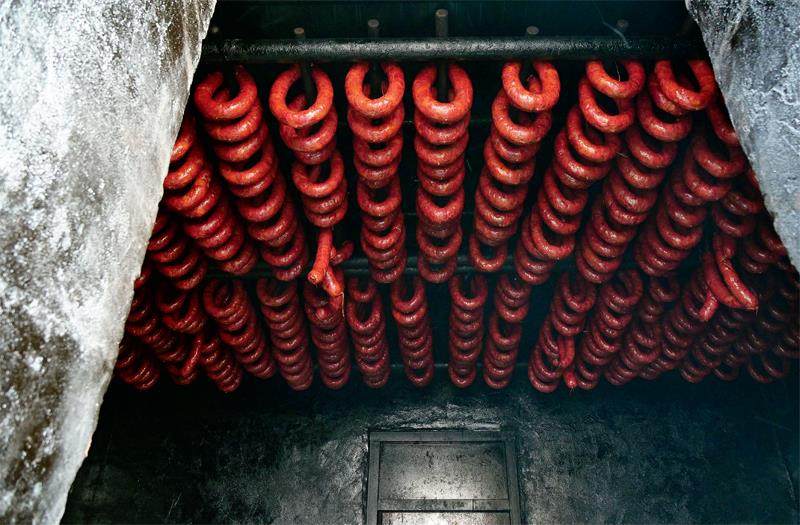 穿越北国的凛冽与南方的温润,方寸香肠竟幻化出万千气象:哈尔滨红肠以胭脂色惊艳时光,安昌黑肠用乌金釉封存岁月;肉枣肠蜷成团圆的符号,套肠叠作千层的思念;熏马肠裹挟着天山松烟,驴肉肠沉淀着中原古韵。当这些风味在地图上烙下鲜明印记,便成就了莱芜南肠、如皋香肠等带着地理胎记的味觉名片。这些或熏或晒的肠衣里,封存着故土的风物密码,让异乡的游子能在蒸腾的热气中,与记忆里的炊烟“相濡以沫”,共诉衷肠。