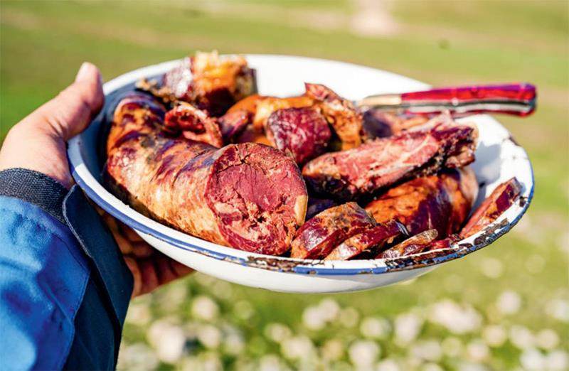 为延续这份自然的馈赠,哈萨克族先民独创烟熏古法—就地取材的熏料让这场风味之旅更添地域传奇。高寒地带的“趴地松”(即西伯利亚刺柏)带来松柏清香,果园里的苹果枝、杏枝则暗藏花果余韵,不同民族的智慧在此交融,共同谱写熏马肠的灵魂乐章。熏制过程堪称温度与时间的精妙协奏。匠人们需时刻守候在松烟缭绕的熏房,既要避免低温延误风味的凝结,更要提防高温引发的油脂自燃。当日光将肠衣染作醉人的棕红,当琥珀色油脂自肠端悄然垂落,方才成就那恰到好处的熏制艺术。