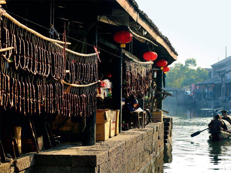 水乡的智慧在晾晒环节臻至化境。纵横交错的河道织就天然风廊,微风穿梭其间,携带着水乡独有的温润气D07di1RP9uHR2CHFKoMlUg==息。临水檐廊构成绝佳的半阴晾场,既得穿堂风带走多余水分,又避直射光照引发的油脂氧化。腊月里,成千上万的黑肠如墨玉垂帘,在氤氲的酱香中完成最后转化,将发酵的艺术演变成流动的水墨长卷。
