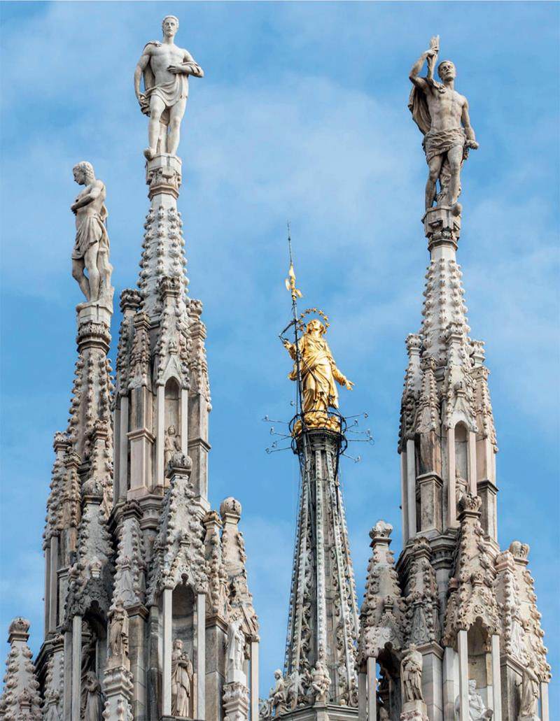 教堂正面以三角形状构建而成,四周的百余座尖塔组成塔林,簇拥着正中高达108.5米的中央塔,似无数利剑刺向亚平宁半岛的苍穹。中央塔顶端,4.16米高的金色圣母玛利亚雕像沐浴着阳光,熠熠生辉。