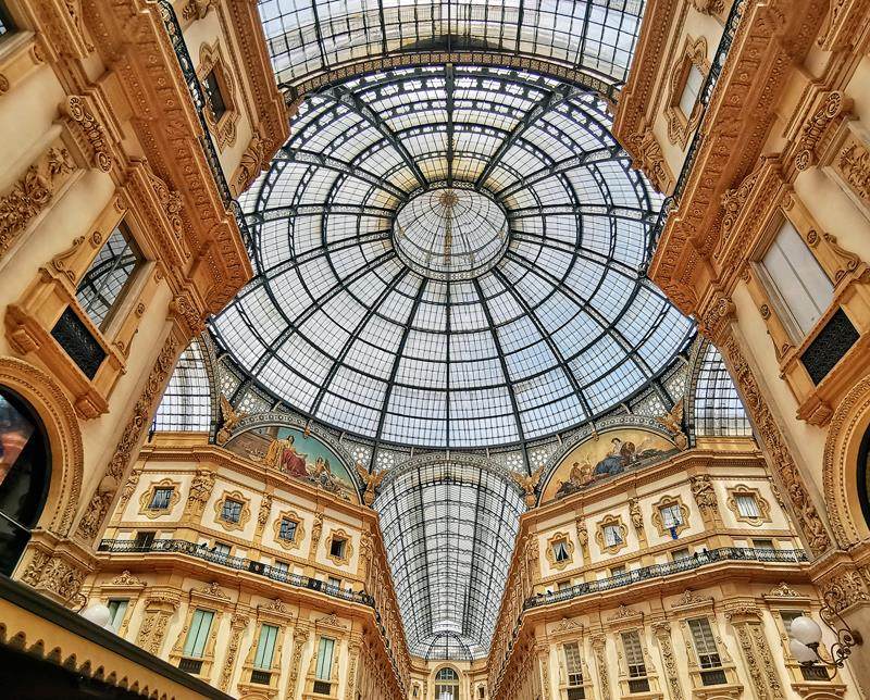 拱廊建筑采用新古典主义风格,融合了罗马古典元素,建筑细节考究且充满艺术气息,两条拱形走廊交叉成十字形,于中央的八角形中庭交汇,中庭上方是47米高的玻璃圆顶。其屋顶用铸铁框架撑起双层夹胶钢化玻璃,并用100万块马赛克碎片拼出象征欧、美、亚、非四大洲的主题画。地面铺装的大理石上有象征意大利各个城市的马赛克图案,华丽而精致。八角形中庭地面还嵌有一块直径1.2米的黄铜罗盘,标注米兰与全球各主要城市的距离,是游客打卡的经典地标。