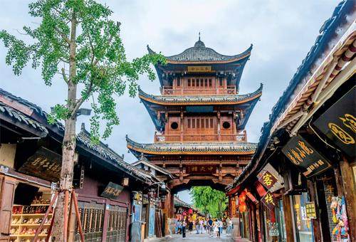 中天楼是古城的核心,又名“四牌楼”,为“阆苑十二楼”之一。因建于阆中古城的中轴线上而得名。该楼始建于唐,毁于民国,2006年重建,楼高20.5米,共三层,楼门四通,宏伟壮丽,气势夺人。作为阆中古城的风水坐标和穴位所在,城中主要街道皆以中天楼为中心,以十字大街为主干,层层展开,布若棋局。登楼眺望,古城的山水格局尽收眼底。
