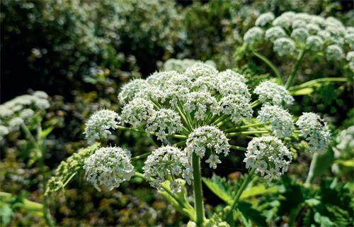 最后,从花序外观区分。尽管两种植物的花序均是由白色小花组成复伞形花序,但花序的形状与着生方式明显不同。水芹的小伞形花序全部顶生,无腋生,花序外观为半球形的伞状,伞辐数量6~16,且不等长,因此呈现一种较为疏散的状态;而毒芹的小伞形花序不仅有顶生的,也有腋生的,伞辐明显多于水芹,且等长,因此,毒芹花序的外观颜值更高,呈现为密集的球形,看上去非常漂亮。