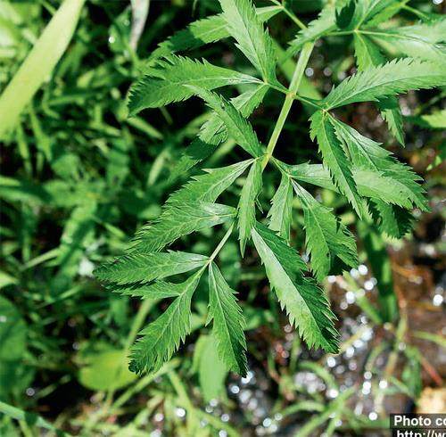 其次,从叶片形状鉴别。虽然两者叶片的总体轮廓都是三角形,但又有所不同:水芹的叶片只有1~2回羽状分裂,且末回裂片的形状为阔卵形至菱状披针形;而毒芹的叶片通常有2~3回羽状分裂,末回裂片的形状是柳叶状的狭披针形。