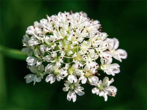 毒芹的花序顶生或腋生,为球形的复伞形。总花序梗长2.5~10厘米,无毛;伞辐数量6~25,近等长。每一个小伞形花序有花15~35朵,花形细小,花瓣白色,为倒卵形或近圆形,长宽仅在1~2毫米,它们密密麻麻地聚集在一起,宛若繁星,十分漂亮。