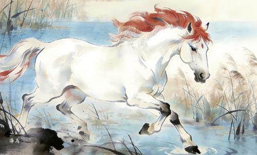 常有人将水马与泽马并提,二者皆与水结缘,但在文化寓意上各有侧重。泽马的形象自带祥瑞“滤镜”,通体雪白如玉,鲜红鬃毛点缀其间,色彩对比鲜明,尽显圣洁灵动。在古代神话体系中,泽马是妥妥的“吉祥象征”,它的出现往往被解读为“ 风调雨顺、五谷丰登” 的预兆, 是水泽之神对人间的眷顾;作为水泽之神的使者或化身,泽马穿梭于湿地、湖泊之间,守护一方水土的生态平衡与生机活力。