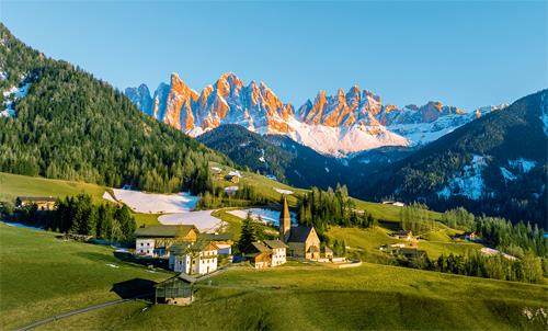 坐落于福内斯山谷中的圣玛达莱娜教堂是最值得探访的春日秘境。这座教堂始建于12世纪,最初为罗马式建筑风格,16世纪融入哥特式元素,其外墙上保留着中世纪的石雕花纹。每年5月,随着龙胆花和虞美人的盛放,教堂掩映在五颜六色的花海中,不远处是高大的塞切达山,构成了多洛米蒂标志性的明信片风光。许多新人都会选择在这里拍摄婚纱照,让古老的祈福之地见证爱情的永恒。离此不远的山谷中,鼎鼎大名的“孤独教堂”孤零零地矗立在广阔的草甸之中。这座教堂是典型的巴洛克风格,拥有洋葱头穹顶,红色的尖顶与雪白的墙壁色彩鲜明,在青山的映衬下,宛如童话小屋。