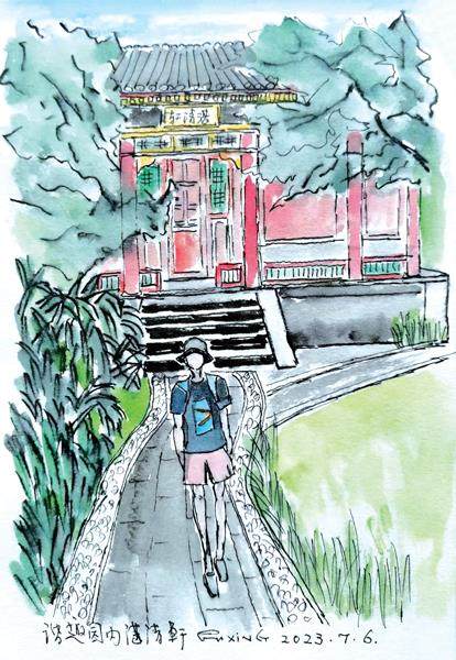 我接着说:“就在这个澹碧亭前面的长椅上,坐着一个女的,她告诉我,你从这椅子上一路跑下来,遇见柱子,就抱着柱子跳过去,然后调皮地接着跑。在这拐弯儿的地方,不小心,从椅子上掉了下来。”