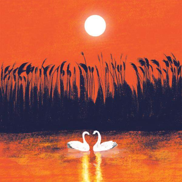 启程的时刻到了,两只天鹅开始惜别。湖边的浅水中长着一丛蒲草,它们就在蒲草丛中依偎着,一会儿头靠头,一会儿喙抵喙。它们虽已相爱了一个夏季,但此时必须分离。因为它们尚未确定是否终生相守。