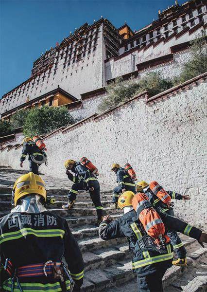 在布达拉宫做消防员,一种例行训练是“冲山跑”。他们穿着全套战斗服、背着水带背包,从山脚的消防大队出发,表现最好的消防员,用时3分40秒就能够跑到德央夏广场,5分27秒可以到达金顶。常年爬上爬下,他们的膝关节比常人更易造成积液和磨损。