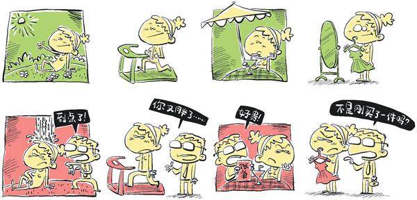 这个红绿活动记录和反思让我有些“走火入魔”,每天一睁眼就好像有一个大的框架——今天阳光明媚,我的心情应该不错,看啥都顺眼,满世界都是绿色……要是阴天下雨,主基调都红了,看谁都是红的……我整天脑子嗡嗡作响,一想到这个红绿记录,眼前就飘过很多幻境,红绿灯、股票大盘、卷子上的叉叉、红鲤鱼与绿鲤鱼与驴……