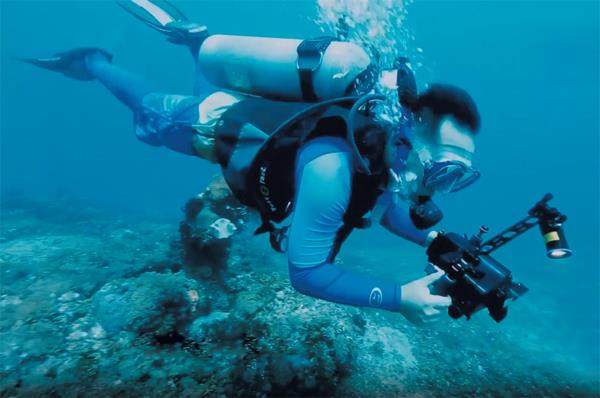 “再仔细检查一遍,看有没有漏气的地方。”2023年6月8日,罗杰穿好脚蹼,与同事做深潜前的最后准备。他的身后是印度尼西亚巴厘岛的北部海域。