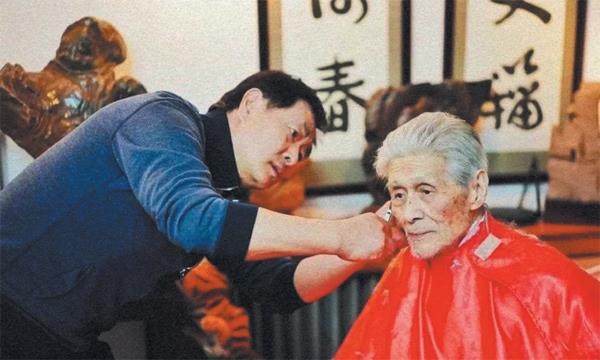 二〇一一年排练《家》的时候,发生过一次险情,但蓝天野老师并没倒下。那天晚上,大家在舞台进行合成排练,我跟在他后面上了舞台,我们走位置时灯光师还在对光,一会儿亮一会儿暗的。没想到光太暗,他过一道门槛的时候绊在了门框上,向前扑出去,跪在五十厘米高的平台上,手撑空了,整个人头朝下栽了下去。八十五岁的老人,脸抡在了台板上,眼镜腿折了。当时我在他身后,但一把没扶着,赶紧跳下平台。围上来的人要扶,我大喊:“谁也别马上扶,让天野老师先别动,缓缓劲儿,看看血压、心脏情况,或者有没有骨折等问题。”蓝天野老师挺清醒,大概看大伙儿全围着,他出于要强,自己要起身。于是大伙儿搀他起来,看到他的眉额处已被眼镜划伤出血了,腿脚还行,便前呼后拥地将他扶进化妆间。他想捋捋头发,一抬手,众人又发现他左手的小拇指完全反着错位了。又一阵惊呼。剧院的卫生员在场,量着血压,但见他的手指折了也没辙。我马上给邻近饭店认识的推拿师徐大夫打电话,正巧,他刚要下班,蹬着自行车就来了。神奇的是,蓝天野老师让徐大夫揉着,也不喊疼,不一会儿,脱臼的手指就复位了。一场虚惊,我们集体送蓝天野老师离开时,他仍然迈着鹤步回头说:“让大家受惊了,对不起!”第二天,蓝天野老师不听劝阻,还是来剧院了,奇迹般地没事,只是额头上贴了纱布,眼镜腿也不知被谁给修好了。