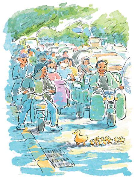 生活节奏很快,行人、车辆川流不息,但总有人愿意为一群鸭子排队过马路而稍等片刻。