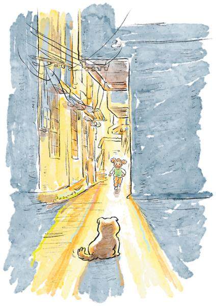 当落日的光漏过楼房的间隙,落在女孩和小狗的身上,一条小巷,有光,有陪伴,也有相遇。