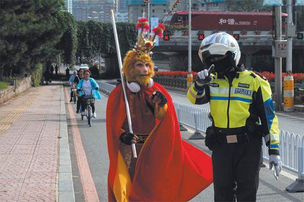 在王天抒的代表作中,有一张打扮成孙悟空模样的人向交警问路的照片。孙悟空作为一个神通广大的人物,竟然需要交警的指引,这样的情景十分有趣,让人过目难忘。画面中他们亲切而自然地交流着,没有一点儿违和感。正是这样的碰撞和对比,使得照片在表层的幽默之下,令人回味无穷。