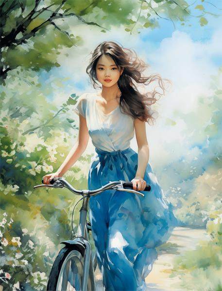 接近晚饭时间,树底下的光线渐渐变暗了,但离天真正黑下来还有一会儿。路边的几棵老楝树开满了紫花,这时候散发出比往常更浓郁、带苦涩的香味。我观看打牌的注意力早已涣散,只等哥哥打完牌,赶快回家吃饭。就是在这个时候,我听见有人小声而急促地喊:“快看,快看,何丽来了!”哥哥他们突然都停下手里甩牌的动作,朝同一个方向望过去。他们一动不动,像在玩木头人的游戏。我也朝那个方向看过去,一个穿连衣裙的年轻女人,推着自行Mn4+va78yQ+WIElUDzUCzw==车走在从病房楼通往门诊楼的路上。她走路的样子和我妈妈、我姐姐、我见过的其他女人都不一样,仿佛踩着某种特殊又轻柔的节拍。她披散的黑发刚刚长过肩膀,穿的裙子青里发白,像月亮刚升起时天空的那种颜色。领口系的飘带和裙子的下摆在晚风里朝后飘,头发也一掀一掀地微微翻飞,和身体的律动相一致,引得我们的心也跟着摇荡、飞扬起来。