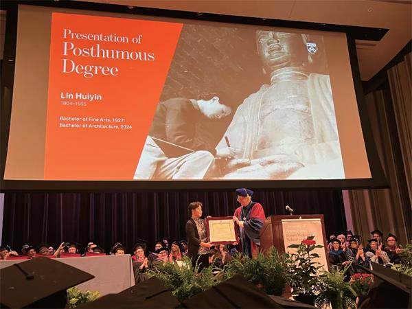 当地时间2024年5月18日傍晚,在宾夕法尼亚大学韦茨曼设计学院的毕业典礼上,宾大正式追授林徽因建筑学学士学位。林徽因的外孙女于葵代表林徽因,从韦茨曼设计学院院长弗里茨·斯坦纳手中,接过了这份迟到近百年的学位证书。
