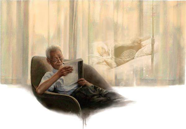 父亲安静地躺在那里,手里举着一本书,另一只胳膊因为抽血而不能动。要这样躺四五个小时,他不能换手,所以他每次到医院都带一本薄薄的书或者杂志。因为这只手被他长时间举着,已经承载不住哪怕稍微重一点的东西。