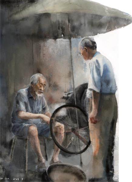 一天,春望遛弯儿路过那个摊位,修自行车的师傅正闲坐着,旁边有两个马扎,虚位以待。修车师傅一脸沧桑。春望觉得这个人好面熟。忽然想起来,这个人是他的发小、老同学爱华。