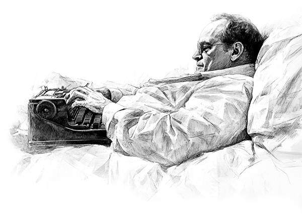到写作《冷血》时,卡波特已经调到白天写作。他的作息表肯定能得到姨妈们的认可,然而我们可以想象,对于他轮着喝咖啡、薄荷茶、雪莉酒和马提尼,她们会作何反应。而且,尽管这一新的癖习会被他的亲戚们视为“正面向上”,但卡波特依然由着自己的性子,躺着写作,拒绝与世俗合拍。
