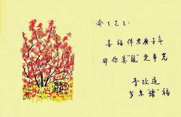 李政道有给友人寄手绘新年贺卡的习惯,上面通常画着当年的生肖像。比如,他在鼠年贺卡上的红梅枝头画几盏红灯笼,上面写着:“鼠”你最有福。