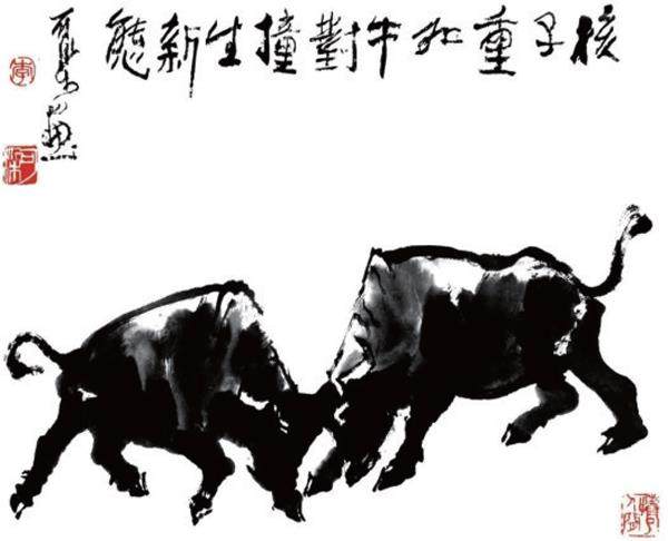 听了李政道对正负电子对撞机的原理的解释,李可染明白,粒子相撞会释放出巨大能量,并从中感受到科学的无穷威力。于是,他一改自己画牛的悠闲姿态的传统画风,用尽全力画了两头顶角的牯牛,“下笔时都能听见自己心脏在剧烈跳动的声音”,最终画出那幅《核子重如牛,对撞生新态》。