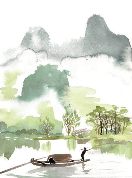 一尾鱼从船边游过,我伸手欲捉,它却打一个水漂儿,隐入深处。水面越发辽阔,山环着水,水环着船,船环着人。索性停了桨,那山、那水一齐向眼前拥来,一片又一片,让人心头生出无限欢喜。