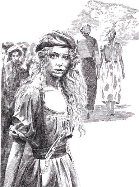 在嘈杂声中,那位妇女把姑娘抱了起来,安放到篓子上,又抖掉贝雷帽上的尘土,给姑娘重新戴好,并精心地把鬈发收拾妥帖,然后她们继续向前走去。